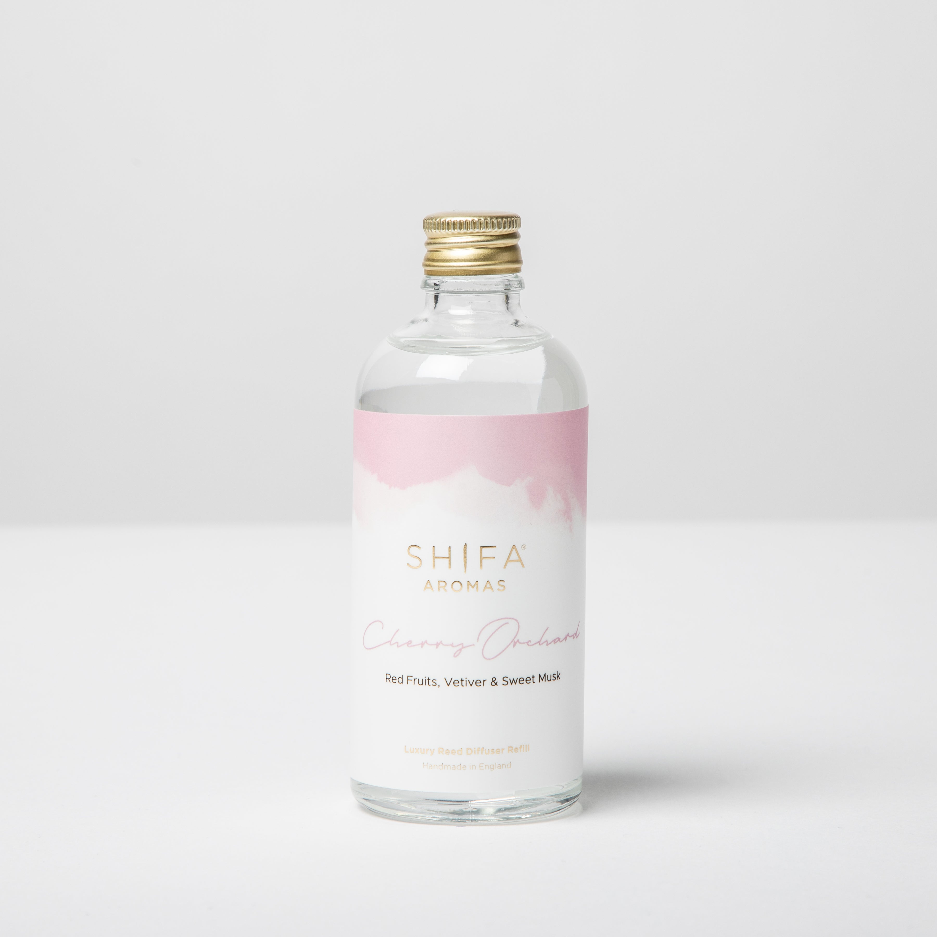 Cherry Orchard is a heartening fragrance that opens with notes of spiced fruits, Palmarosa and Vetiver. This fragrance base rests elegantly on notes of sweet Musk, Dark Rose and Cashmere. This luxury candle and diffuser is infused with burgundy Cornflowers and delicate Cherry Blossom like Delphinium petals.